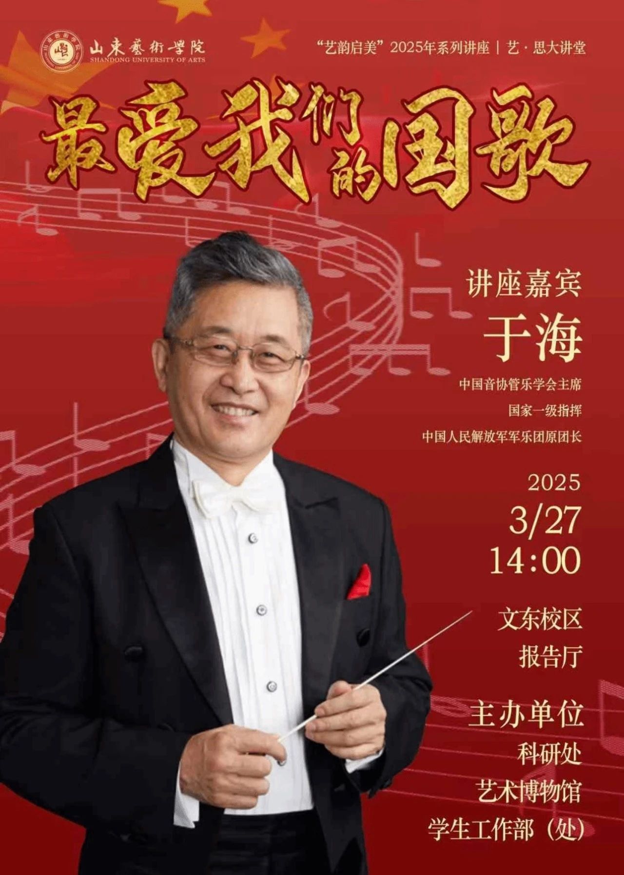 3月27日,中国人民解放军军乐团原团长、国家一级指挥于海教授应邀在我校文东校区报告厅,作了题为《最爱我们的国歌》的专题讲座。活动由我校科研处、艺术博物馆和学生工作部(处)联合主办,现代音乐学院组织...