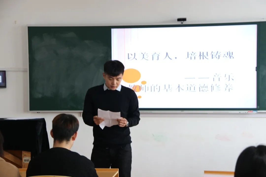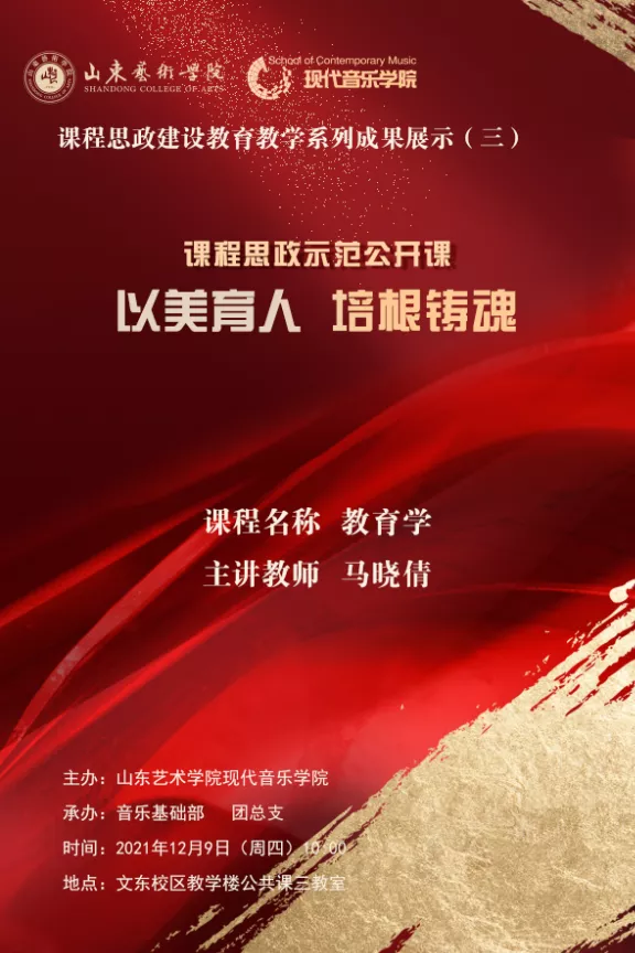 2021年12月9日上午,由现代音乐学院基础教学部教师马晓倩主讲的课程思政公开示范公开课《“以美育人,培根铸魂”——音乐教师的基本道德修养》在文东校区公共课三教室举行。公开课由现代音乐学院主办,基础教学部和团总支承办,基础教学部主任何苏杰主持。学院领导、相关师生参加了本次活动。
