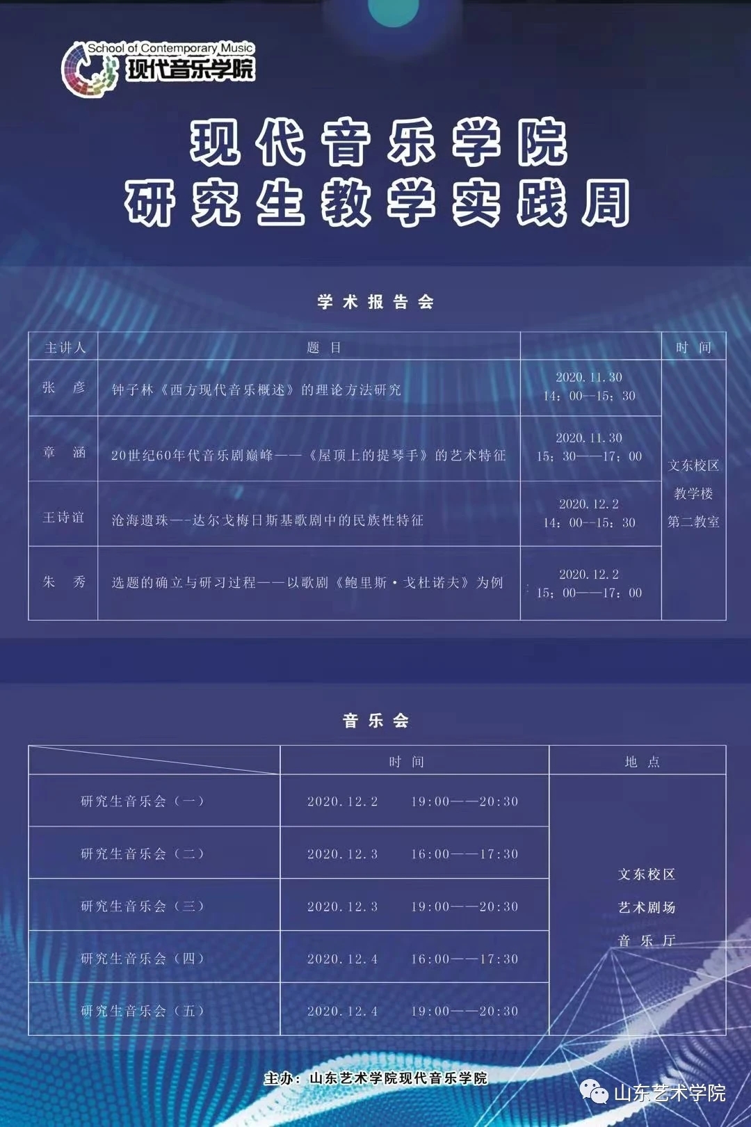 现代音乐学院成立工作专班修订了本科和研究生九个专业方向的人才培养方案。举办了音乐剧专业教学研讨会、山东省高校合唱指挥人才培养体系及课程方案研讨会、音乐治疗专业教学成果报告会等教研活动。不断深化教学改革,荣获山东省第七届“超星杯”高校青年教师教学比赛三等奖,三项教改项目和一项思政课程教改项目获批学校教改项目,一门课程获批学校在线开放课程项目建设项目。通过与省立医院、山东省话剧团、中小学签订教学实践基地合作协议,积极探索产教融合的新路径;通过开展学生专业技能大赛、“研究生教学实践周”、专场音乐会等活动,为学生搭建教学实践平台;通过邀请来自美国、英国、俄罗斯、韩国等国家的多位专家开展教学、讲学活动和举办音乐会,为师生搭建国际交流平台。
