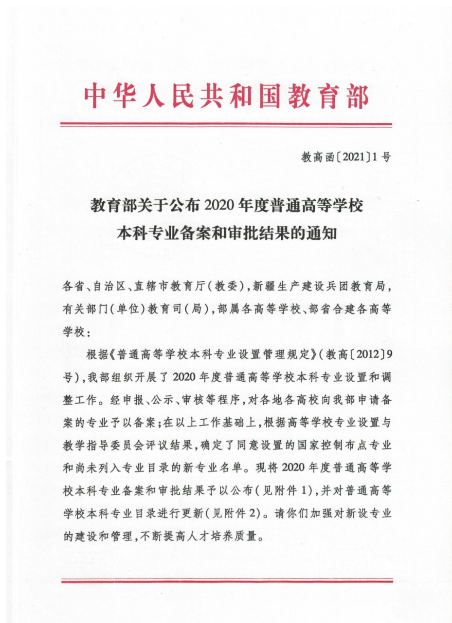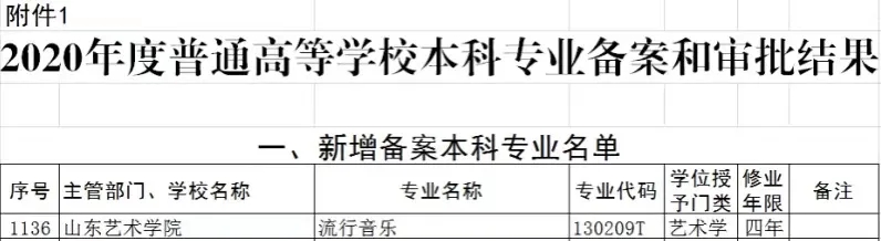 近日,教育部下发了《关于公布2020年度普通高等学校本科专业备案和审批结果的通知》(教高函〔2021〕1号)。该《通知》对普通高等学校本科专业目录进行了更新,共有37个专业被列入普通高等学校本科专业目录的新专业名单(2021年)。我院申报的“流行音乐”本科专业通过审批,获得教育部批准备案,专业代码130209T。
