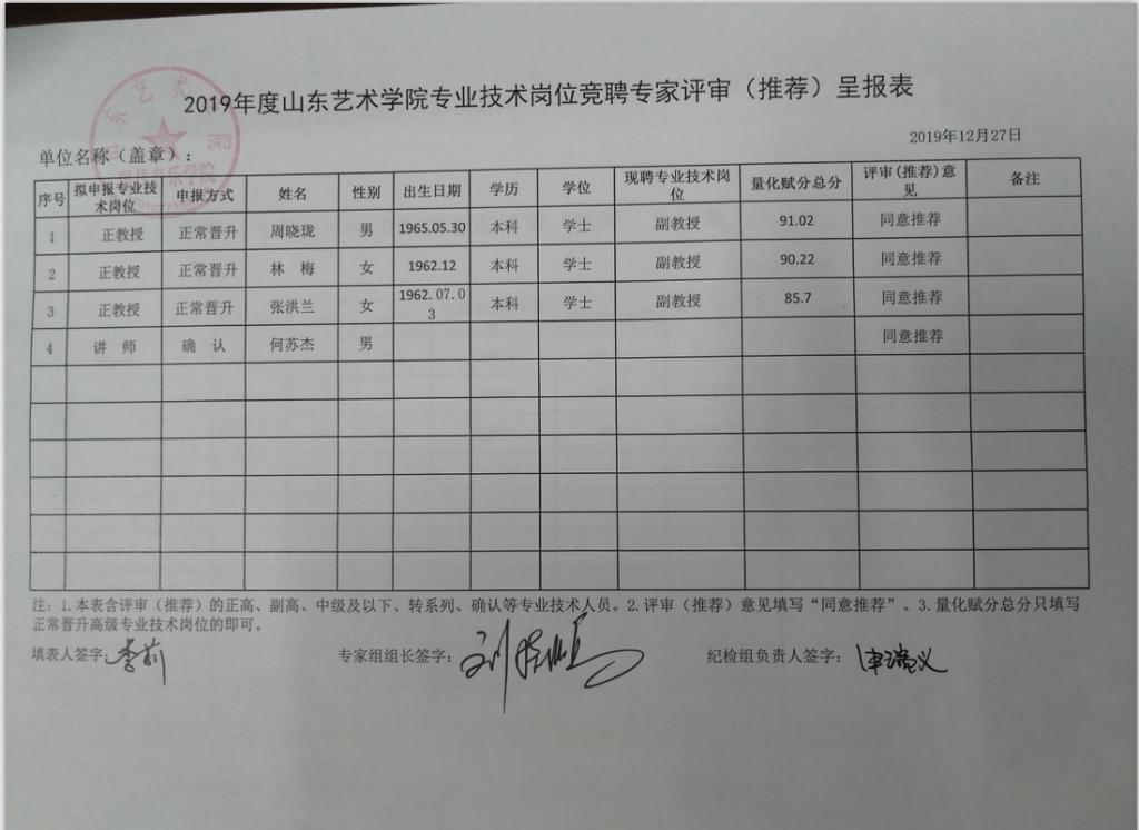 2019年度山东艺术学院专业技术岗位竞聘专家评审(推荐)呈报表
