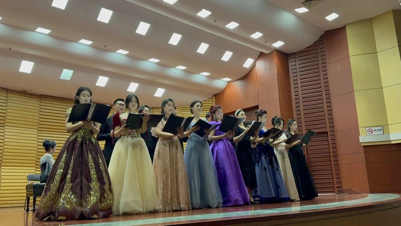 在重唱环节,经典歌剧《费加罗的婚礼》《唐璜》《魔笛》选曲使现场观众充满期待,同学们的演唱及表演获得阵阵热烈的掌声与喝彩声。音乐会的合唱环节将现场气氛推向高潮,女声合唱《在东方山顶上》采用了与中国歌曲《茉莉花》相同的曲调,男声合唱以阿卡贝拉的形式演绎了《桑塔露琪亚》选段,让人感受到了音乐的纯净与美好;四位女生演唱的《玫瑰人生》使观众仿佛置身于浪漫的法国街头,感受到那份唯美的情感。最后,音乐会在返场曲目《欢乐颂》《Time to say goodbye》的优美歌声中落下帷幕。