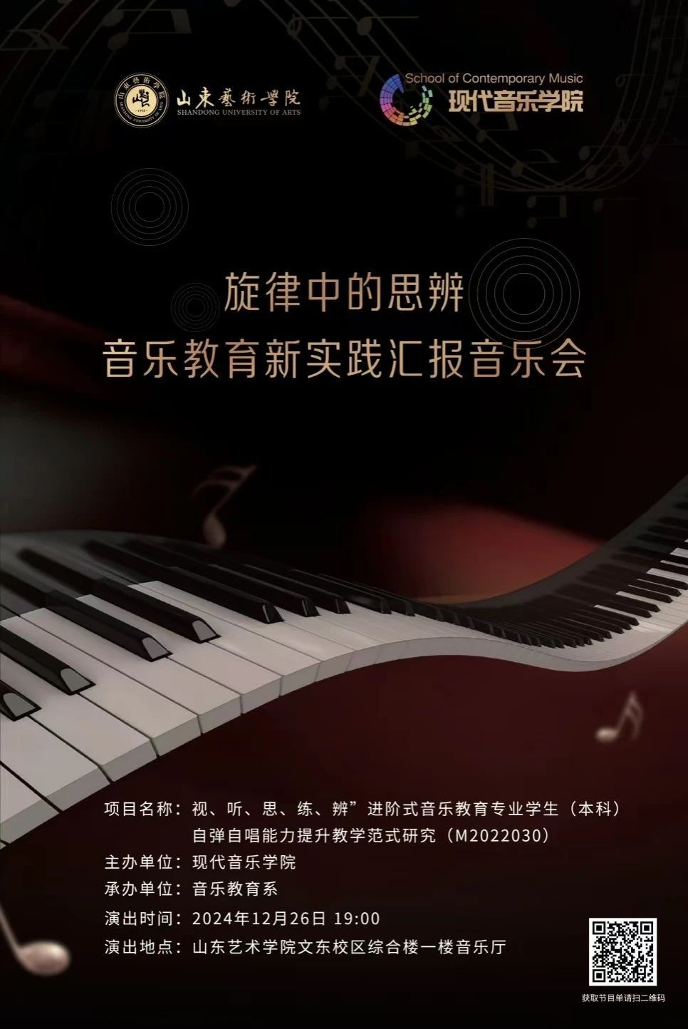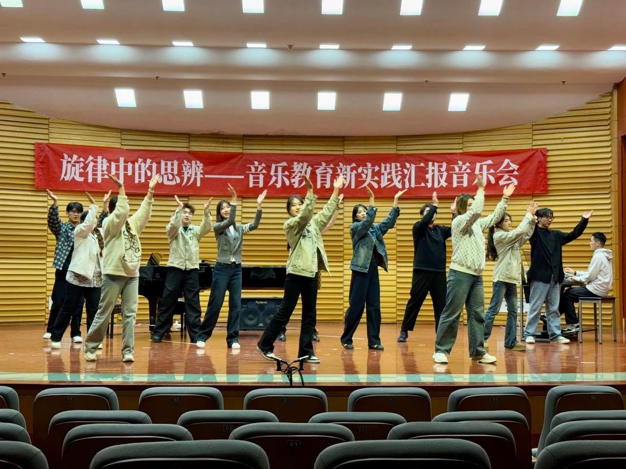 12月26日晚,“旋律中的思辨——音乐教育新实践”汇报音乐会在文东校区综合楼一楼音乐厅举办。音乐会由现代音乐学院主办,音乐教育系承办。现代音乐学院党总支书记盛作文、院长杨春红、副院长刘晓鹏及各专业师生300余人现场观看演出。