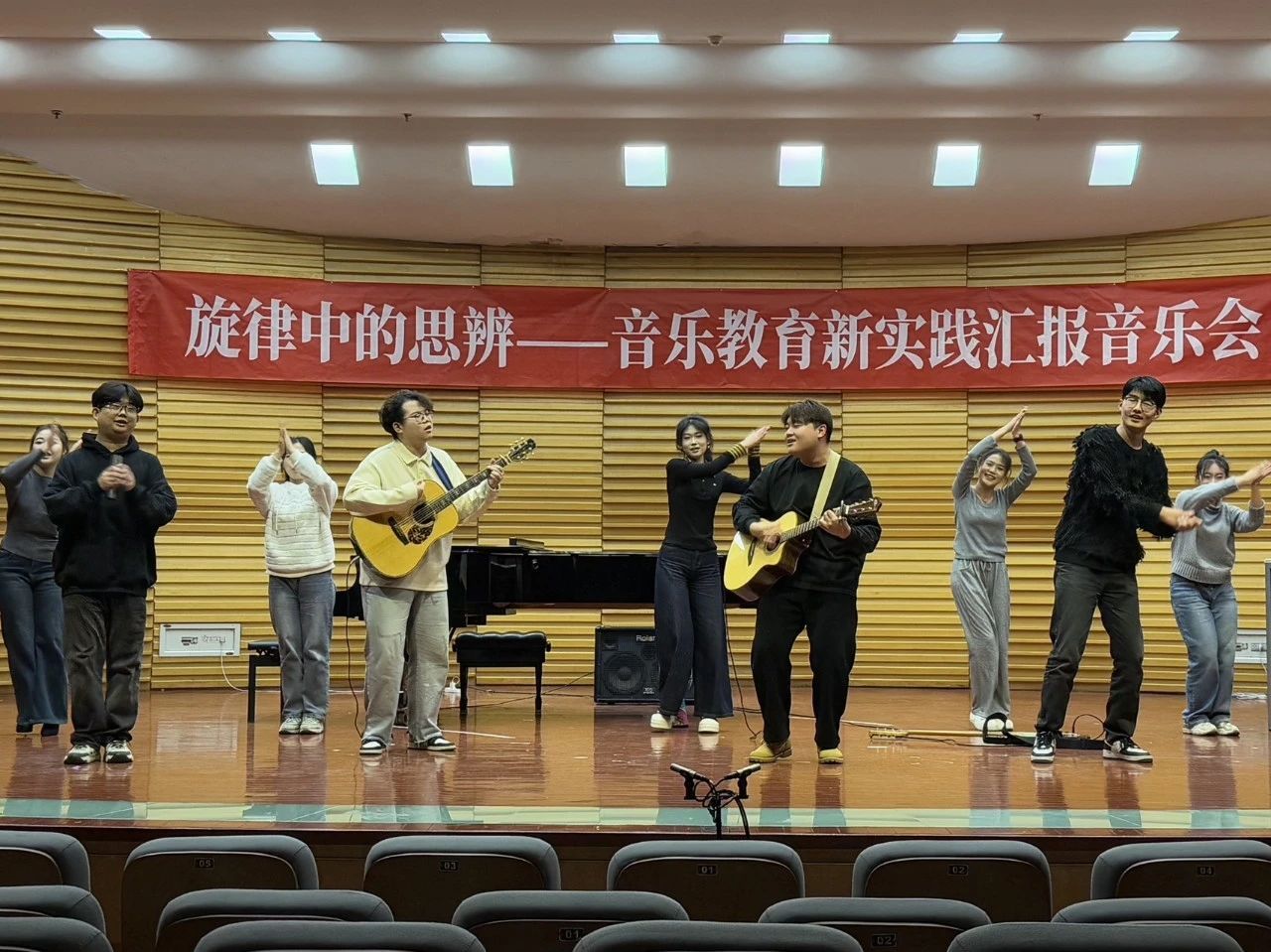 本场音乐会既是我院音乐教育专业本科人才培养教育教学改革成果的生动呈现,也是山东省本科教学改革项目“视、听、思、练、辨——音乐教育专业学生(本科)自弹自唱能力提升进阶式教学范式研究(M2022030)”(负责人:武晓亮副教授)的阶段成果展示。下一步,我院将持续深入推进教学改革,构建实践教学新模式,优化教学体系结构,丰富优质教育资源,凸显学生学习的核心地位,创建专业技能与实践生动结合的平台,培养学生的创新思维以及跨学科、团队协作的能力,向着新时代教育人才目标不断前进。