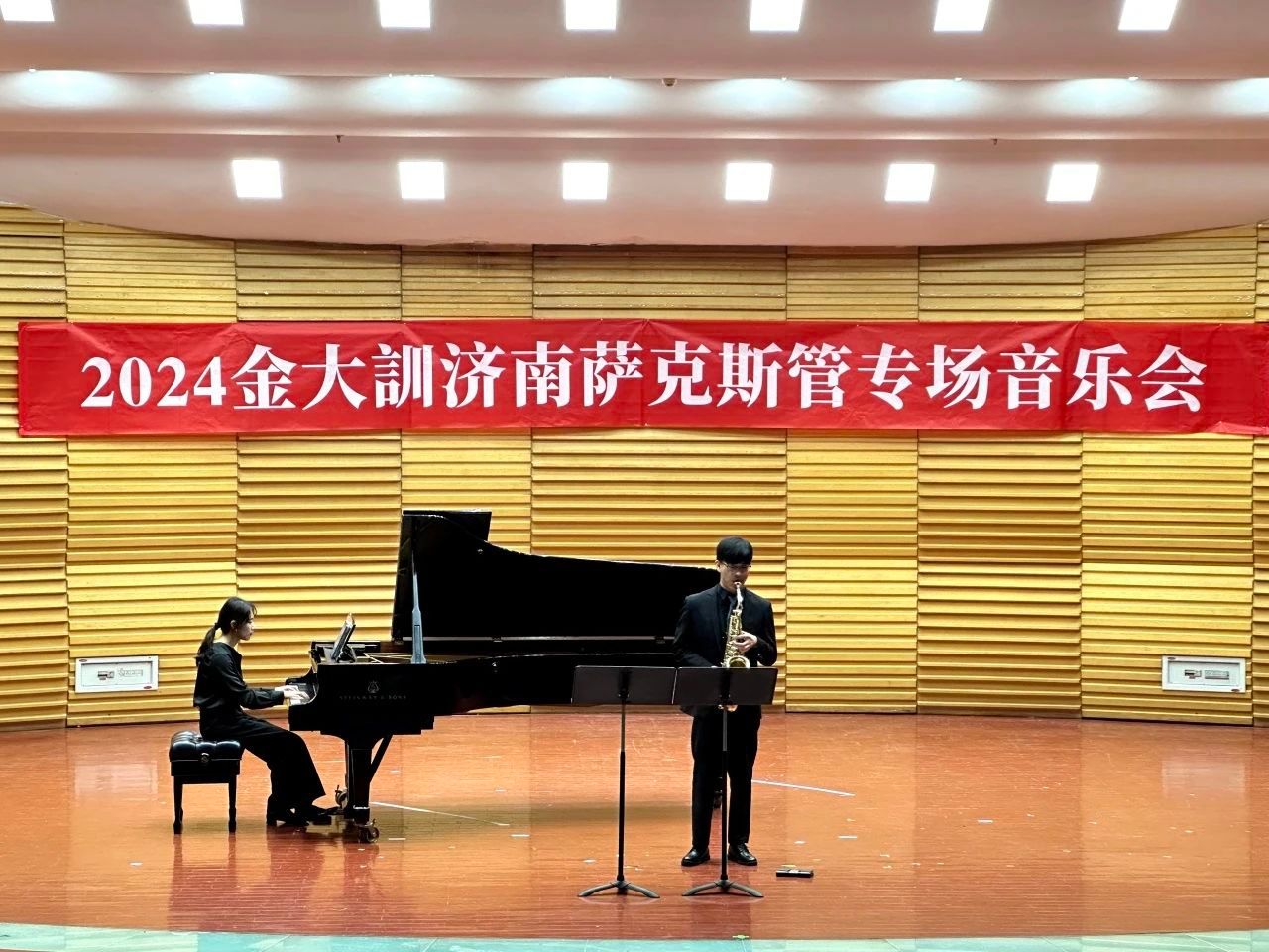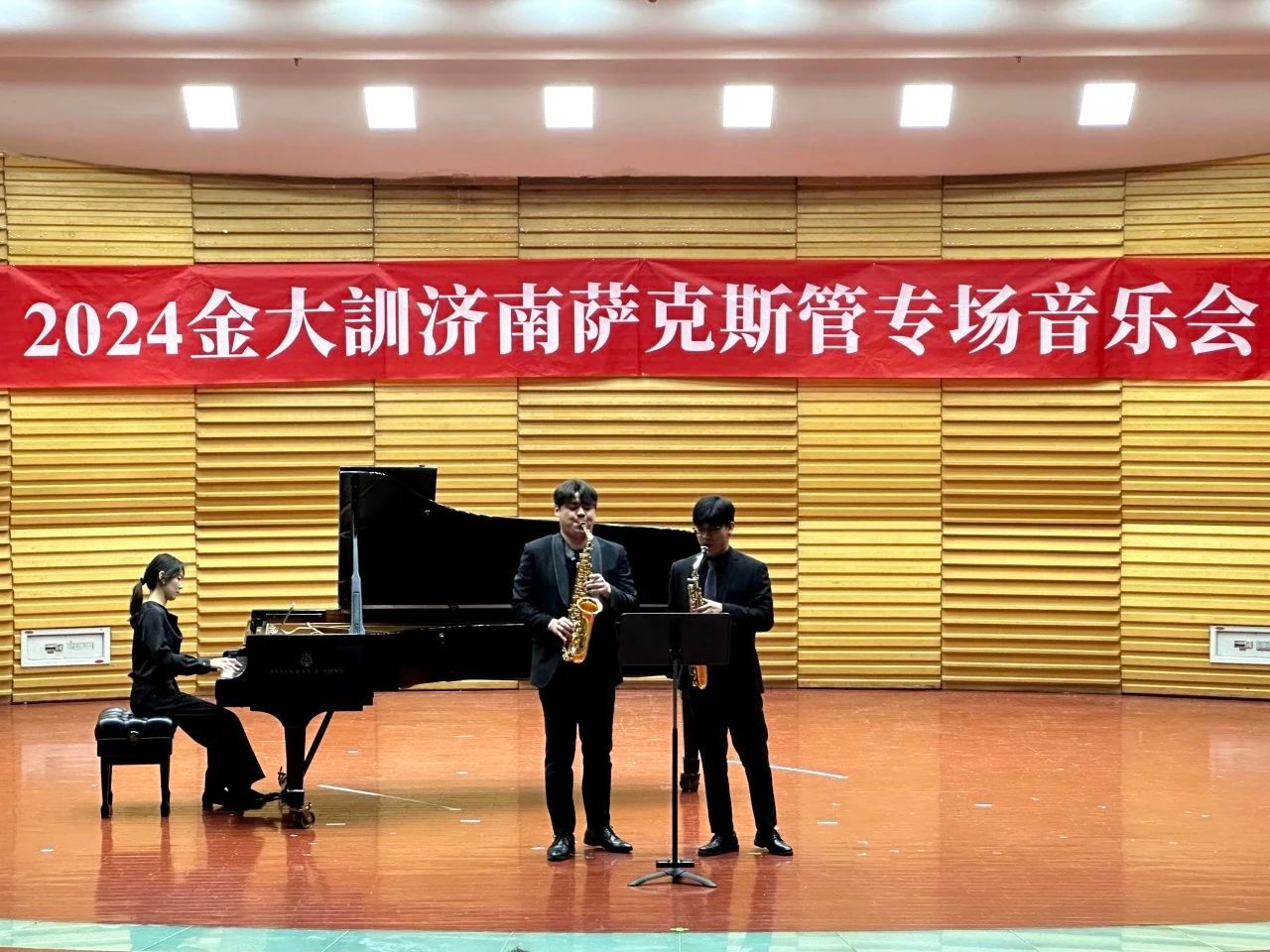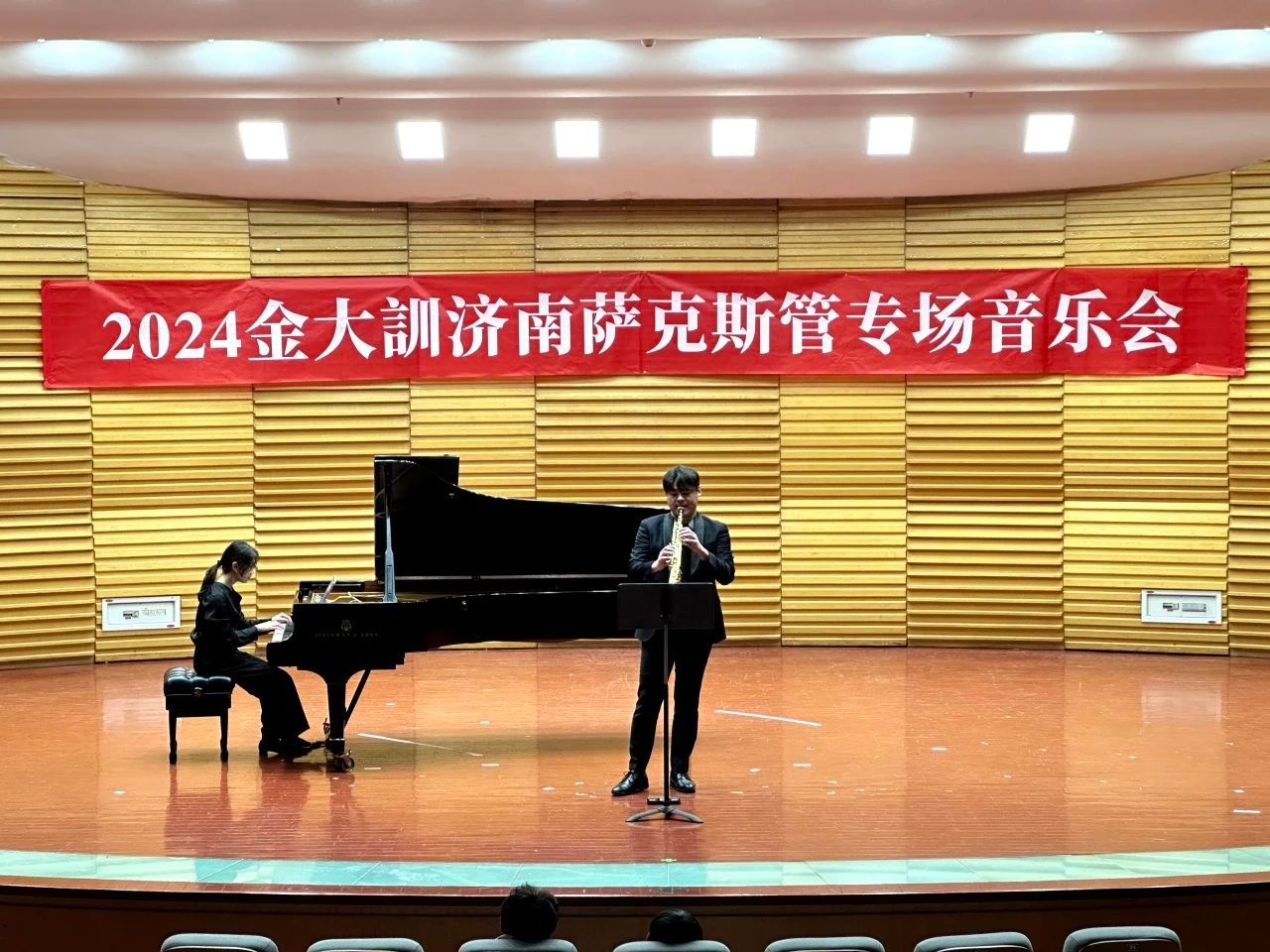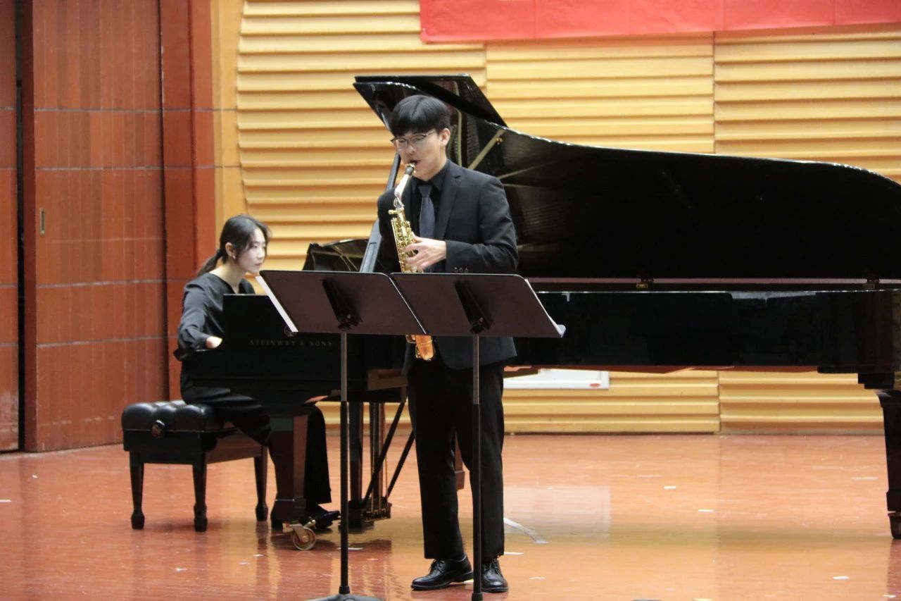 26日晚,2024金大訓济南萨克斯管专场音乐会在文东校区艺术剧场一楼音乐厅举办。金大訓和来自韩国的钢琴艺术指导朴成恩共同演绎了克劳德·德彪西的《狂想曲》(Claude Debussy - Rhapsodie)、罗伯特·舒曼的《幻想曲集》(Robert Schumann - Fantasiestucke, op73)、文森特·大卫的《脉冲》(Vincent David - Pulse)和文森特·大卫的《海市蜃楼》(Vincent David - Mirages)4首作品。中场期间,现代音乐学院2019级校友段贺一演奏了威廉·奥尔布赖特的《奏鸣曲》(William Albright - Sonata)的第一、第四乐章。优美的乐声、动听的旋律和艺术家精彩的演绎,让观众深深地感受到了萨克斯管的独特魅力,现场不时响起阵阵热烈的掌声。