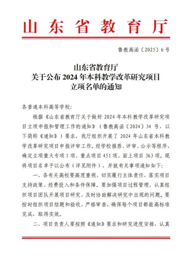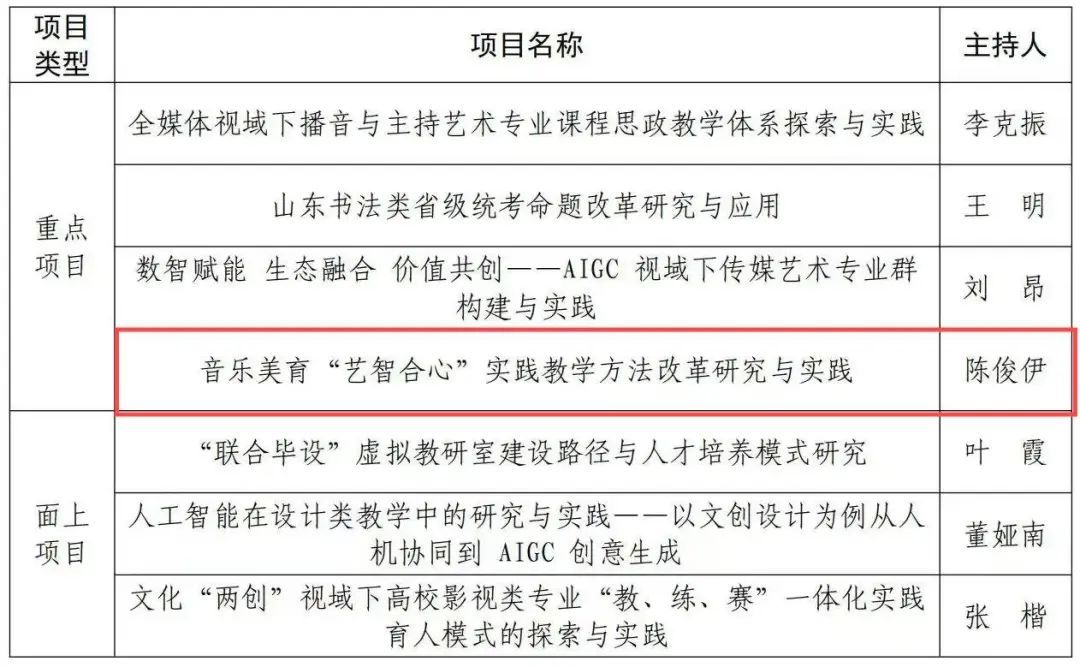 近日,山东省教育厅公布了2024年本科教学改革研究项目立项名单,现代音乐学院陈俊伊副教授主持的项目《音乐美育“艺智合心”实践教学方法改革研究与实践》成功获批省级重点项目立项。