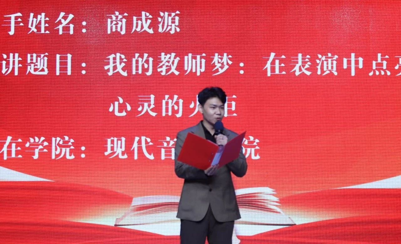 商成源的演讲题目是《我的教师梦:在表演中点亮心灵的火炬》,分享了自己的音乐剧教师梦,音乐剧是一门融合了歌唱、舞蹈和戏剧的综合性艺术,不仅让人感受到音乐的魅力,更让人明白团队合作和情感表达的重要性。