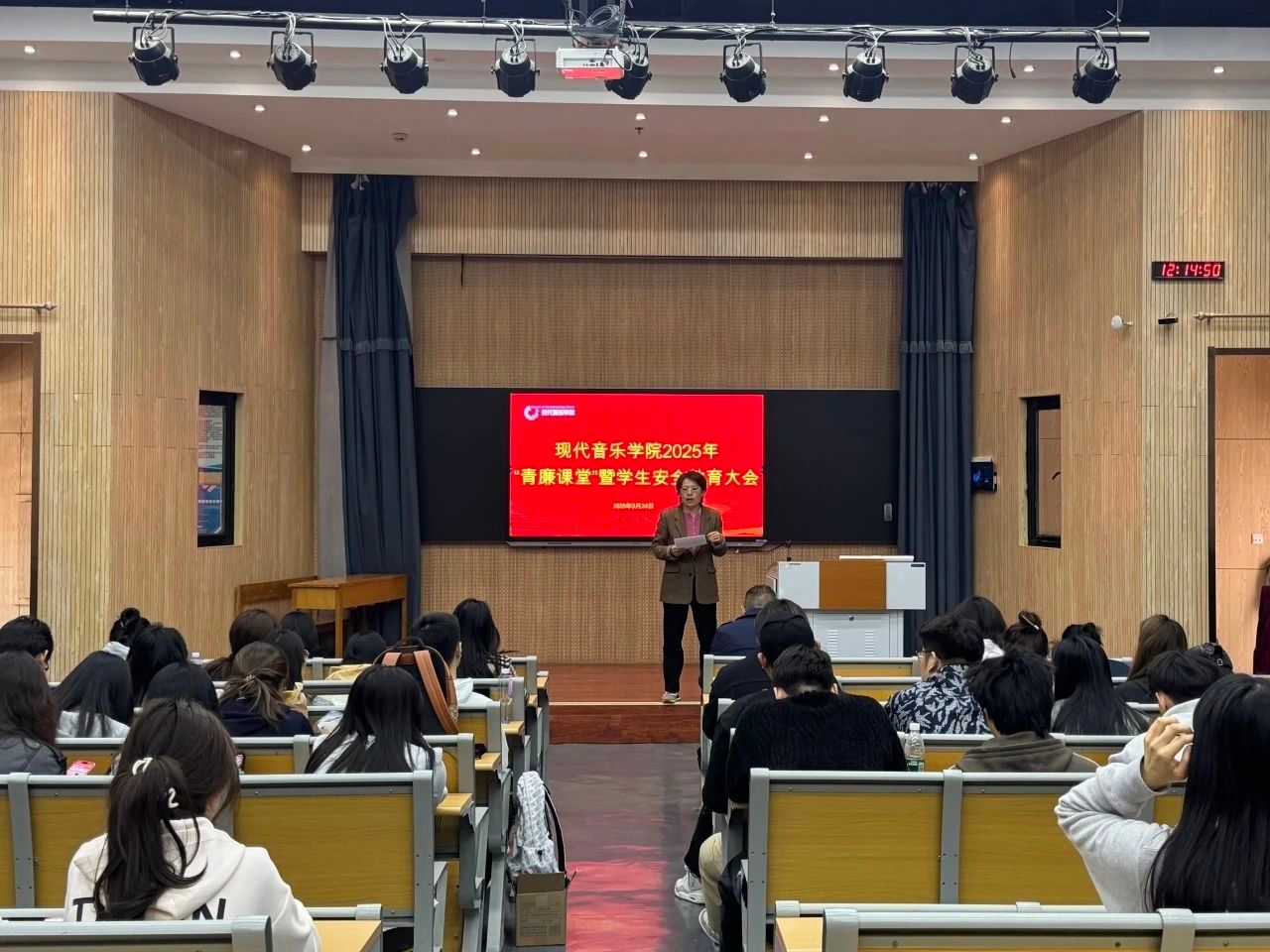 3月24日,现代音乐学院在文东校区报告厅召开2025年“青廉课堂”暨学生安全教育大会。学院党总支副书记杜建、团总支书记范志华、辅导员李晶莹,全体学生干部、学生代表共200余人参加会议。