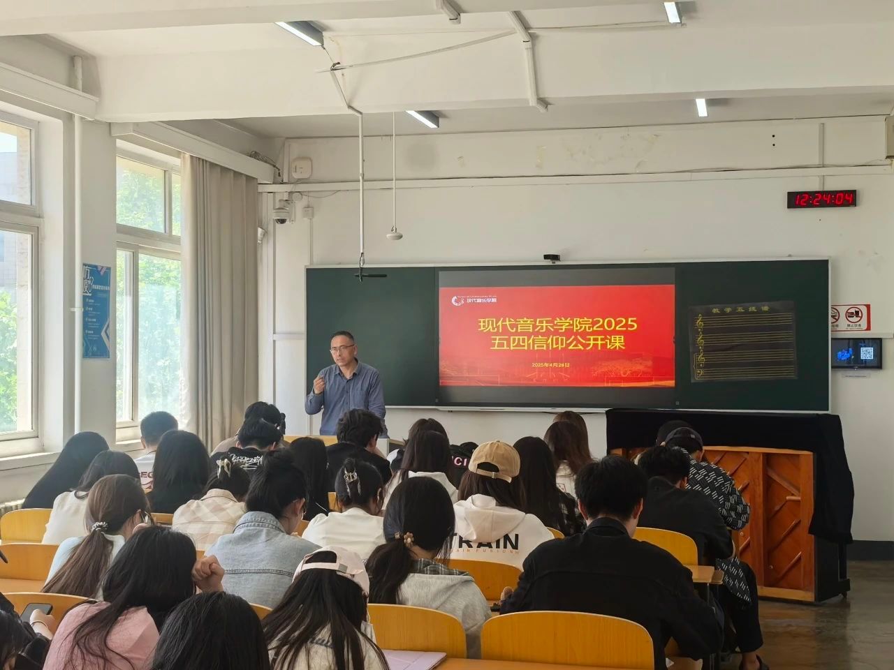 4月28日,在五四青年节即将来临之际,现代音乐学院在文东校区教学楼公共一教室开展以“凝聚青春力量,共7筑时代担当”为主题的五四信仰公开课。立足时代背景,结合学院实际,从多个维度为青年学子带来了一场思想盛宴。学院党总支副书记杜建和60余名团员青年参加活动。