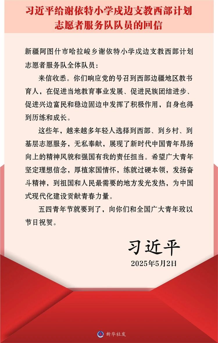 习近平总书记的回信,饱含着对青年的深切关怀与殷切期望,更是对全体青年的一次精神鼓舞。坚定理想信念,是总书记对青年的重要嘱托。谢依特小学的志愿者们,正是因为心中有坚定的信念,才会毅然选择到艰苦的边疆支教。对于我们而言,在日常的学习和生活中,也会遇到各种挫折和挑战。只有坚定理想信念,才能在面对困难时不轻易放弃,始终保持积极向上的心态,朝着目标奋勇前行。