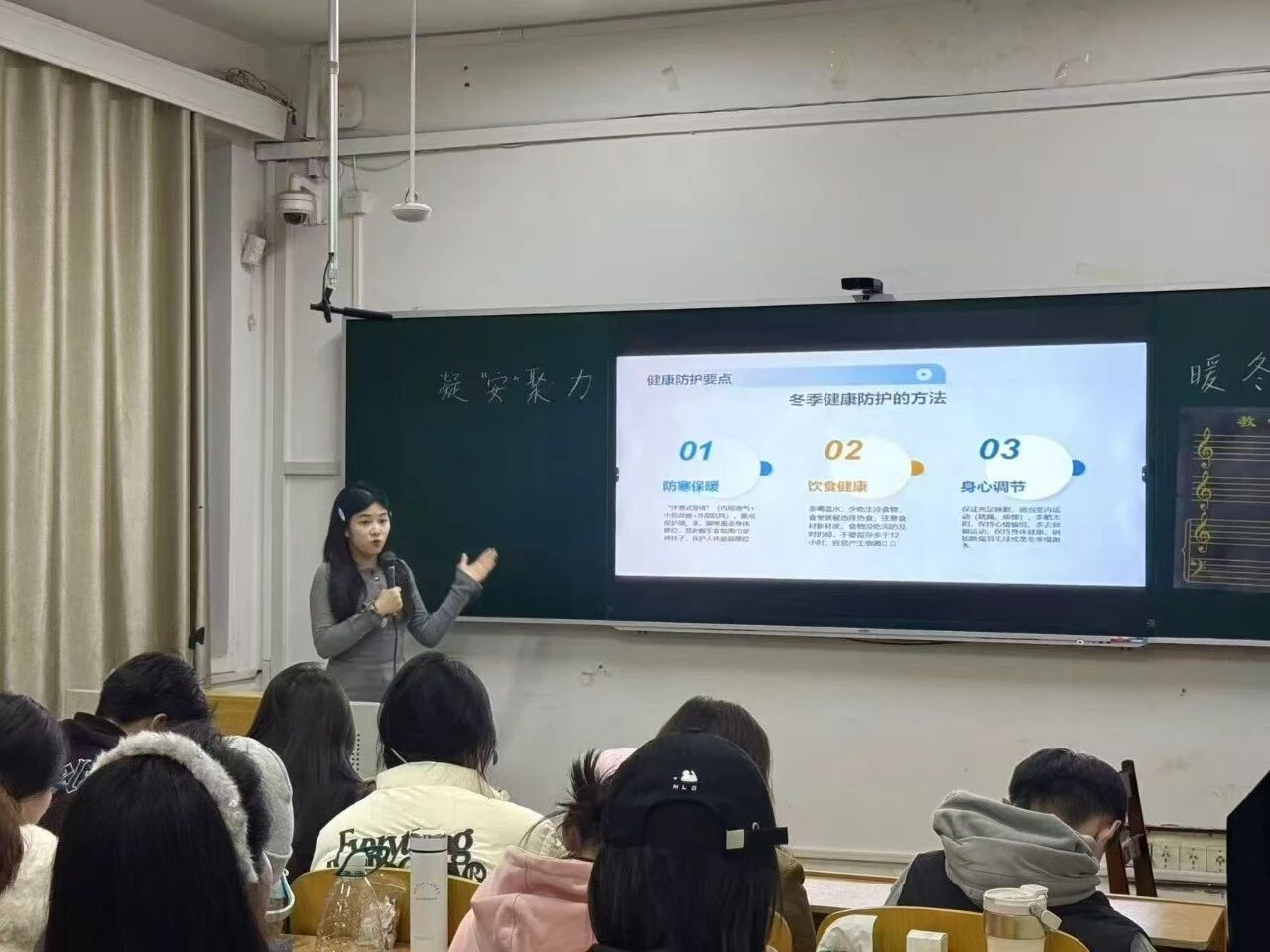 在趣味互动环节,由15位同学依次登台分享冬季趣味穿搭与生活小妙招,现场掌声不断,同学们在相互借鉴中解锁了更多安全过冬的技能。